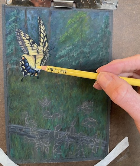 Since my go-to surface is 400 grit UART paper, my first test was using 400 grit black sandpaper purchased from Home Depot. Black because it happened to be on sale! I also decided to use an alcohol wash for the background to see why the technique was so popular. Trying and comparing different wash techniques may be a future post. Even though the grit was the same as the UART paper, I found the tooth of the hardware sandpaper more abrasive and the “teeth” or grain less uniform. There was a difference in quality. Overall, I think using the hardware sandpaper for experiments, students/teaching demonstration, and small pieces (the size of In Flight below is 6×9) as an excellent inexpensive alternative to the UART paper.