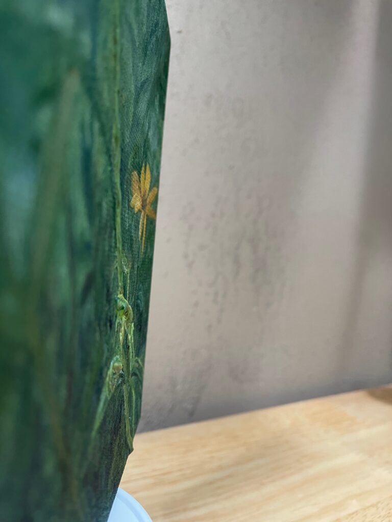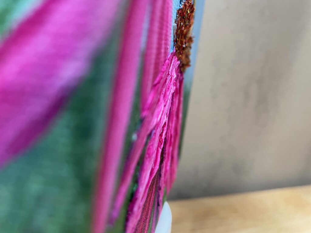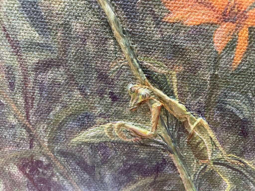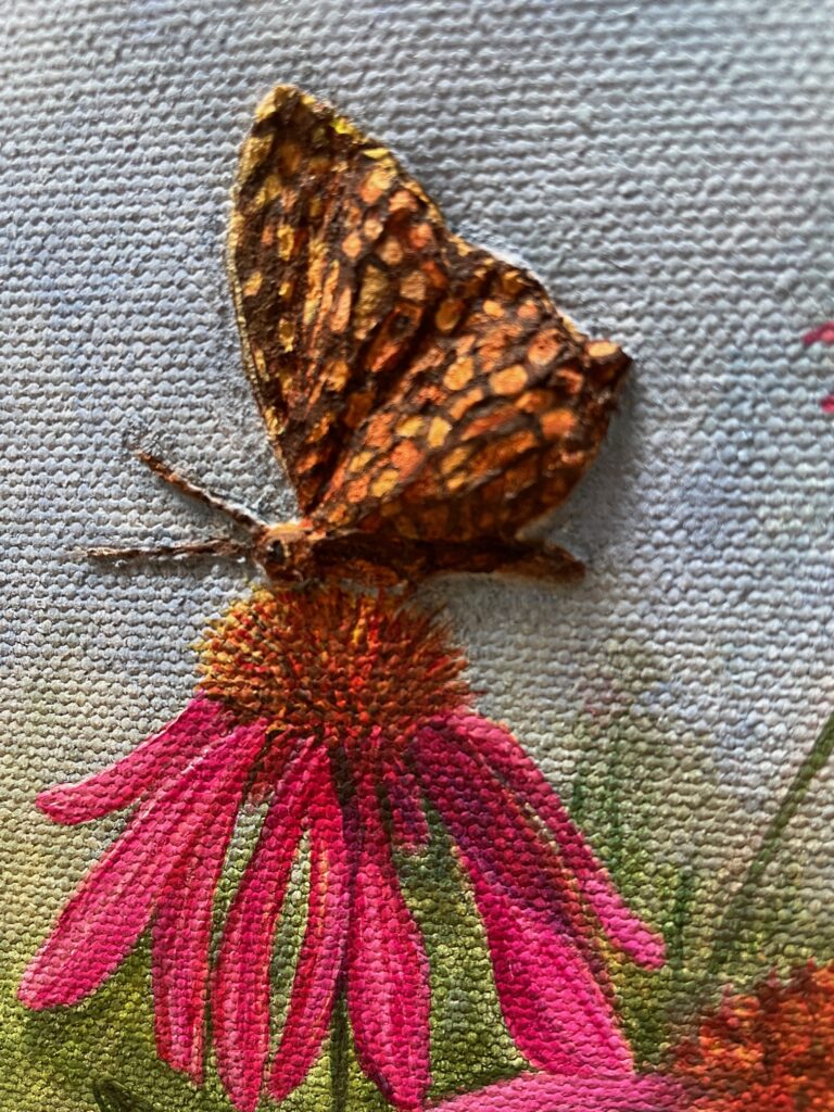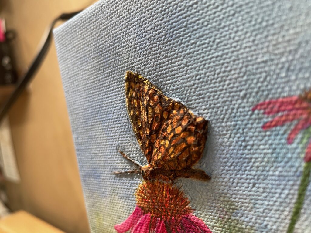 I used Kamenskaya Sculpting Paste for the butterfly in Quick Rest below. This paste is the most matte and thick of the three, and has a dryer, porous texture similar to air-dry clay. I used a palette knife to apply it to the canvas and found it easy to manipulate and smooth with a wet paintbrush. Dry, it resembles fine concrete, which dried faster between multiple layers. I could not sand (to smooth) or carve (to shape) the completed, dried form, so smoothing while wet is critical (unless a rough, jagged form with sharp edges is desired).