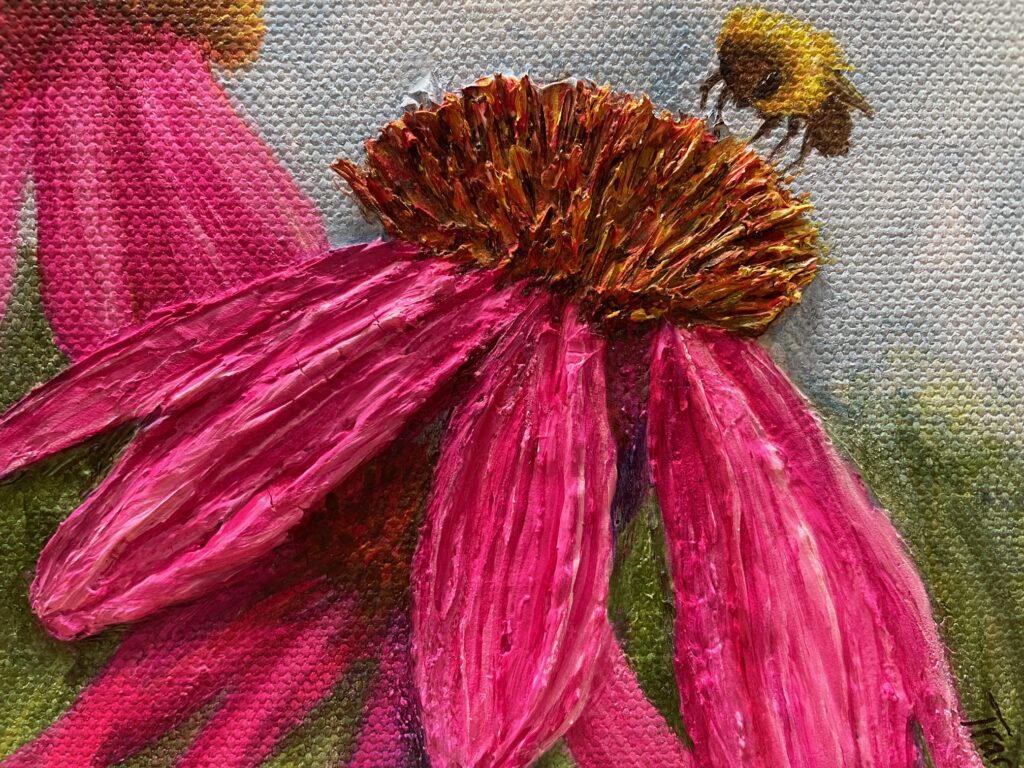 I used Liquitex Modeling Paste for the echinacea in the foreground of Landing below. This paste also looks and applies like thick Elmer’s glue, but is stickier than the Golden, which makes layering and smoothing harder. It dries matte with a texture of dry toothpaste. Of the three, it was the only to have a few cracks when dry, so next time I will cover it to dry more slowly. I could carve and sand the final, dry form if needed.